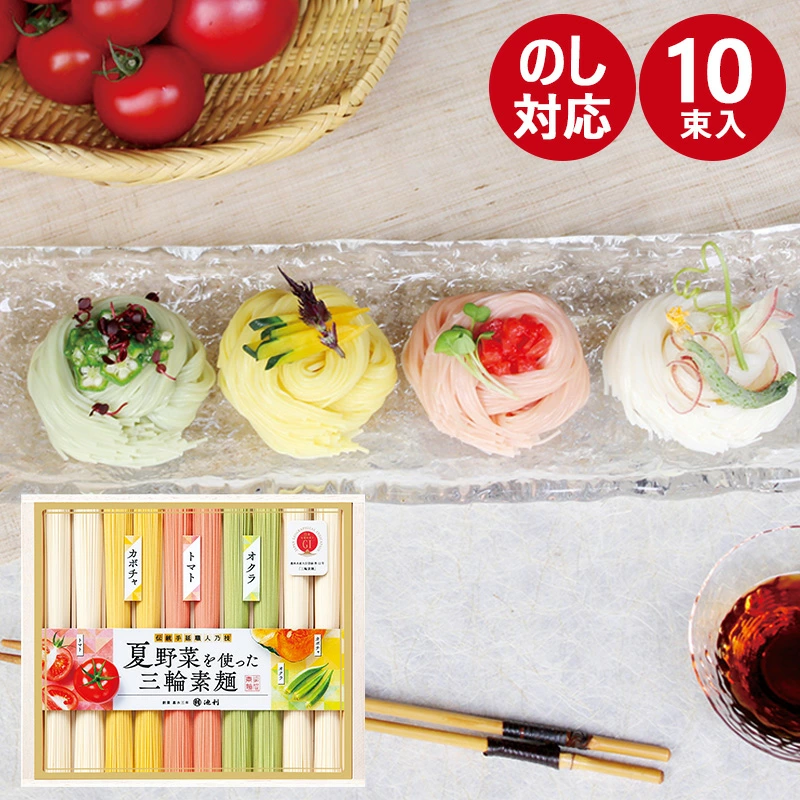 「池利 夏野菜を使った三輪素麺 NY-20A」は、三輪素麺の本場・奈良の老舗「池利」が誇る、鮮やかな国産そうめんのギフトです。トマト・オクラ・カボチャの3種の夏野菜を練り込み、素材の風味や彩りをそのままに仕上げた彩り豊かな素麺と、伝統の白素麺を詰合せました。