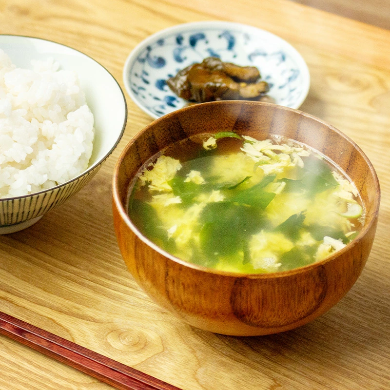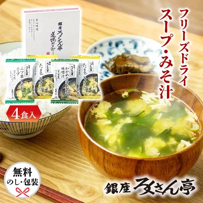 たまごスープを中心に、わかめと油あげの味噌汁、三ツ葉と卵のスープがセットになった3種4食入り。