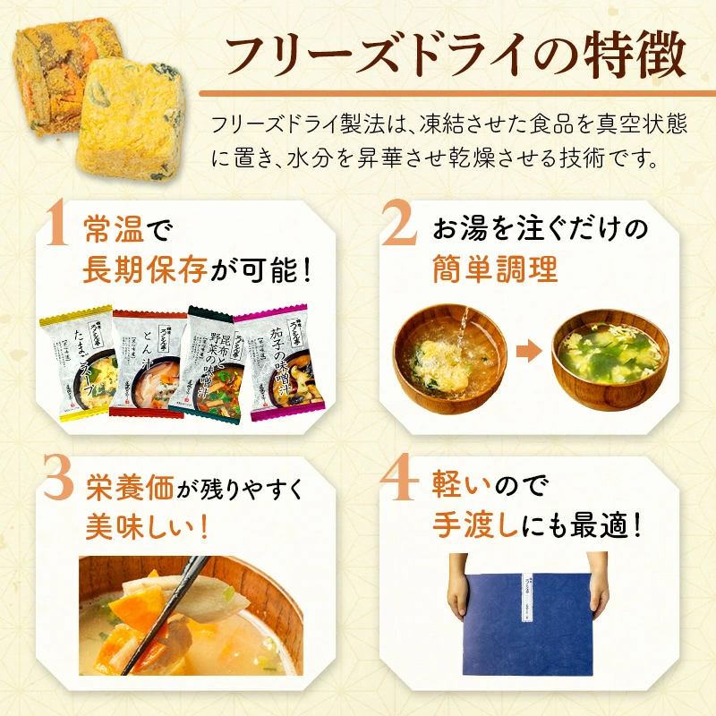 銀座の名店「ろくさん亭」監修、道場六三郎のこだわりが詰まったフリーズドライギフトセットです。和食の魅力をそのまま封じ込めた即席スープです。